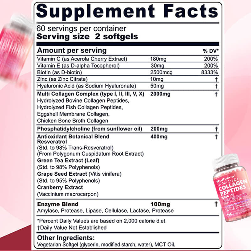 คอลลาเจน softgels ของเราได้รับการเสริมทรัพยากรด้วย 4 สารผสมพืชอินทรีย์ และวิตามิน C, E, บิโอตินและซิงก์ เพื่อเพิ่มการป้องกันสารกัดออกซิเดนต์รวมถึงส่วนประกอบที่สนับสนุนการย่อยและการทําลาย เพื่อส่งเสริมการดูดซึมอย่างมีประสิทธิภาพ.